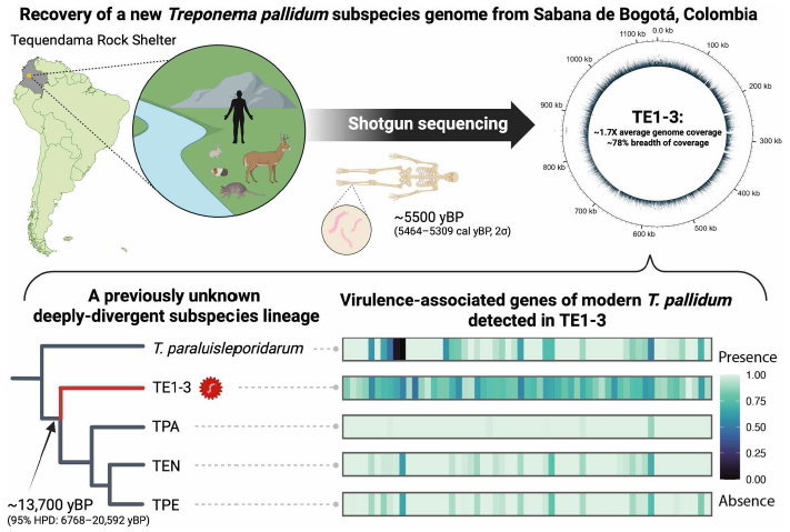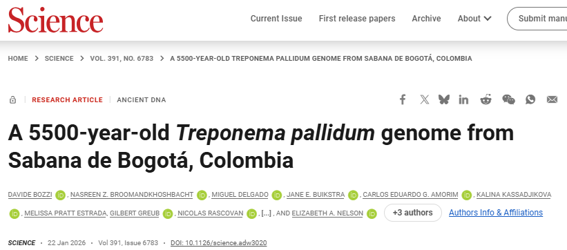 2026年1月22日,美国加州大学、瑞士洛桑大学研究团队在"Science"期刊上发表了一篇题为" A 5500-year-old Treponema pallidum genome from Sabana de Bogotá,Colombia "的研究论文。